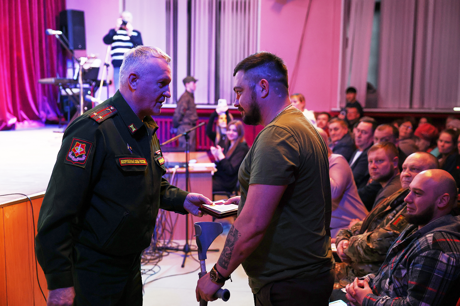 Торжественное мероприятие прошло 23 февраля в районном Дворце культуры. Правда, не все ребята смогли подняться на сцену, чтобы получить медаль. К некоторым из них Андрей Аладинский, военный комиссар Каменского, Крутихинского, Тюменцевского районов, спускался в зал. Серьезные травмы еще не зажили, поэтому некоторые герои СВО еще скованны в движениях. Один из парней отсутствовал и награду в торжественной обстановке получила его супруга с маленькой дочкой.