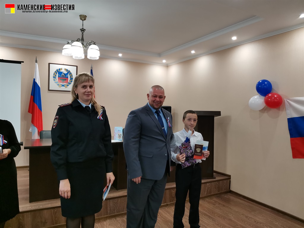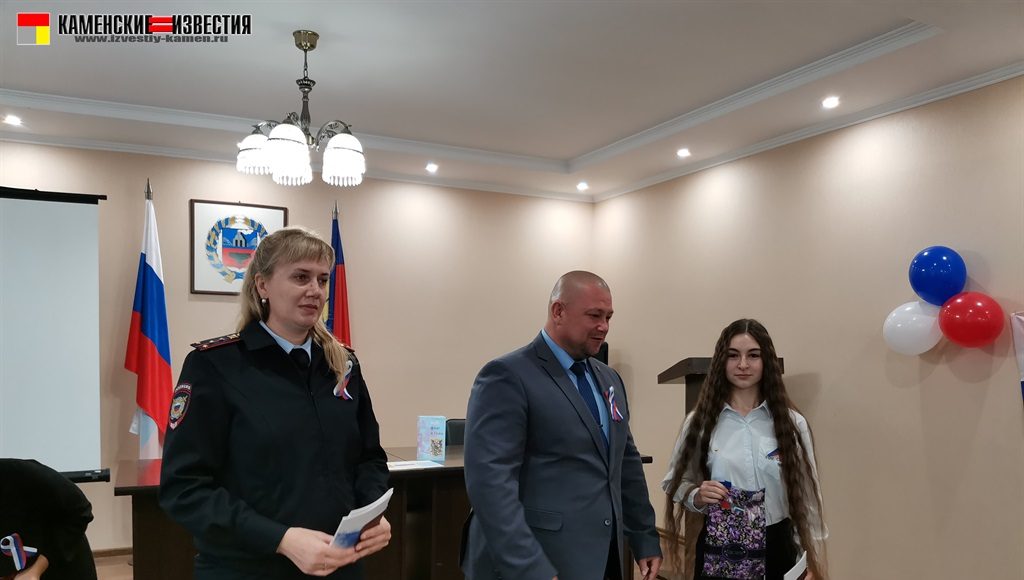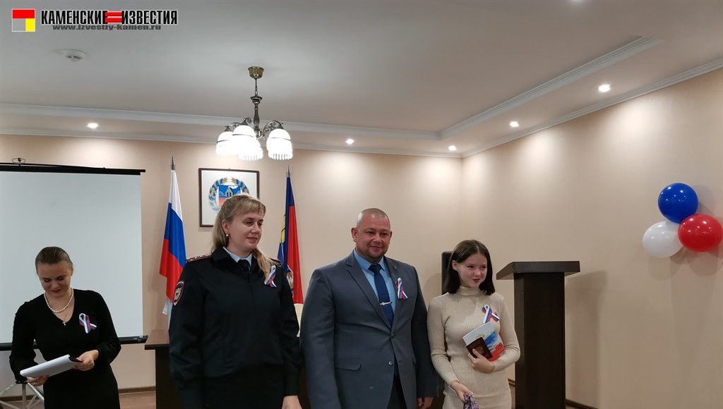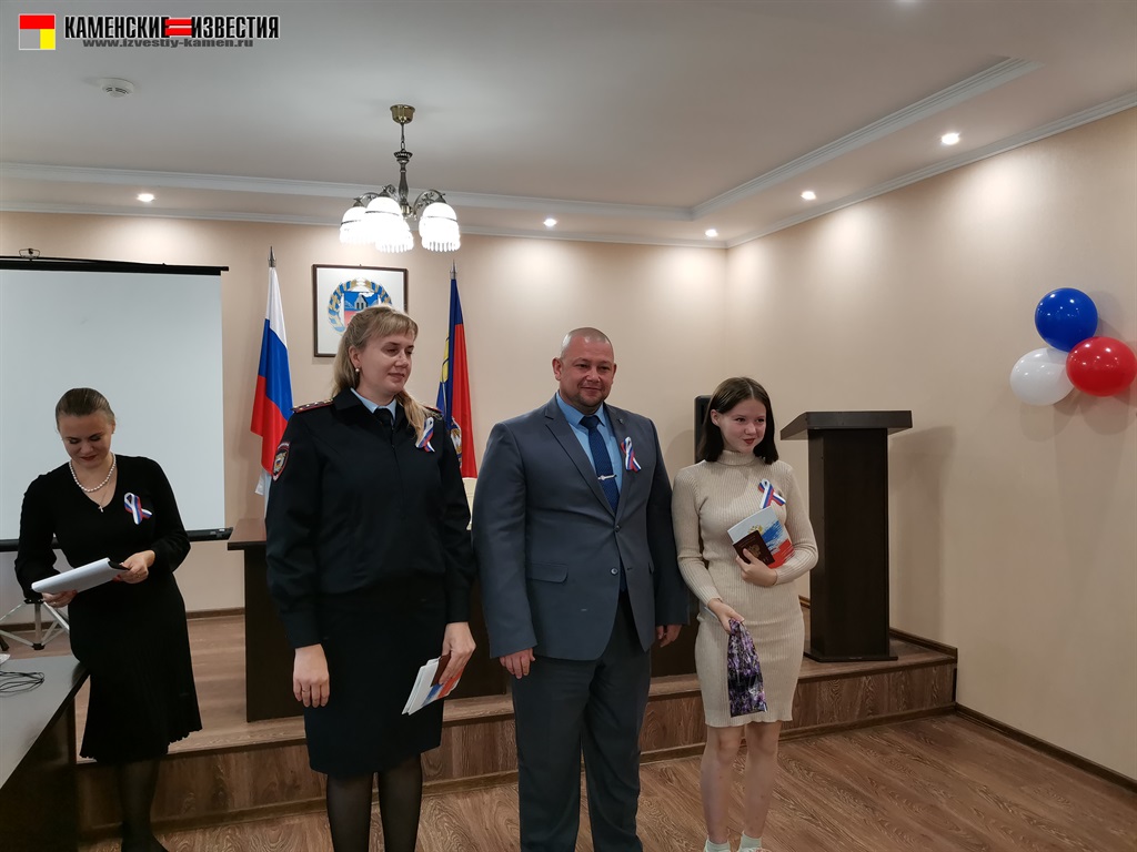 На мероприятии присутствующие познакомились с историей Государственного флага и приняли поздравления, а затем и паспорта от начальника отделения по вопросам миграции МО МВД России «Каменский», капитана полиции Анны Тамошевской. На торжественной церемонии свои документы получили Екатерина Костюковой, Вадим Козырев, Анна Рубцова, Владислав Никулин и Вероника Тименко.