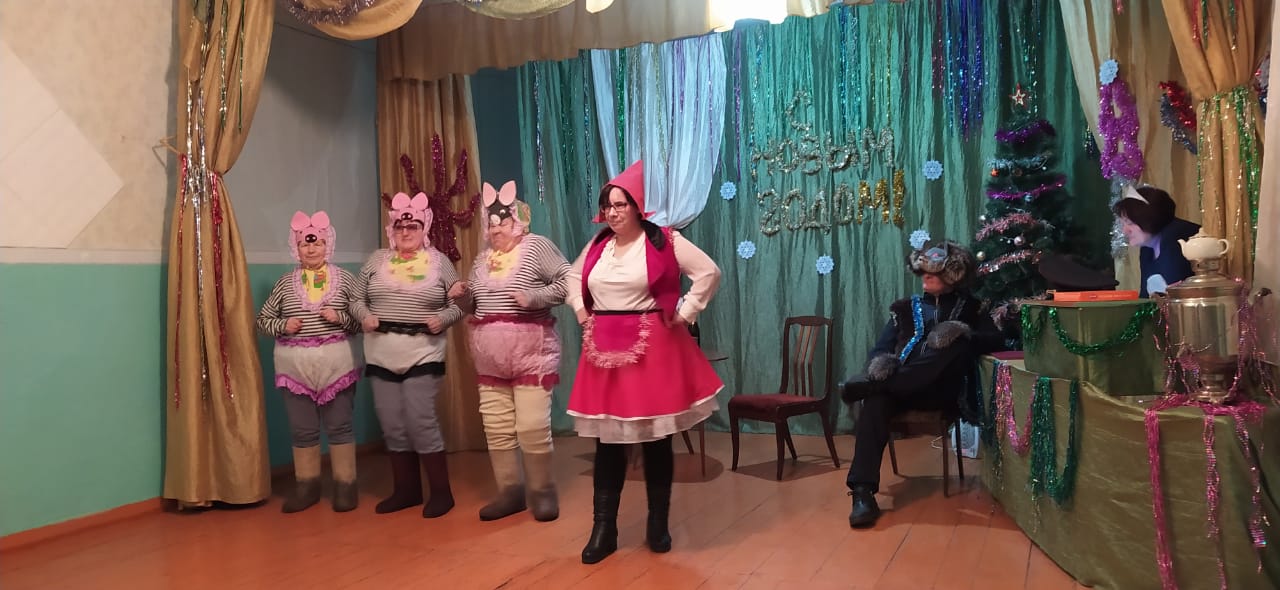 Юмористические персонажи спектакля: «Нюра-буфетчица» (Людмила Охременко), «Оперуполномоченный Даша» (Татьяна Балабаева), «Машенька» (Валентина Козлова), «Медведь» (Нина Дудукаленко), Медведица (Вера Литвинова) вызывали своей игрой смех в зале. Особый фурор на зрителей новогоднего представления произвел танец трех поросят (Надежда Ядрова, Татьяна Балабаева и Нина Дудукаленко). Празднично украшенная сцена, яркие и смешные костюмы персонажей, изготовленные своими руками, а также интересная игра актеров спектакля — все это вызвало восторг у зрителей. В завершение спектакля зрители провожали полюбившихся персонажей бурными аплодисментами с просьбой повторить спектакль на Старый Новый год.  Всем, кто посетил в этот день Дом культуры, было весело. Публика расходилась по домам с прекрасным настроением в ожидании чего-то нового и лучшего в наступающем 2023 году.
